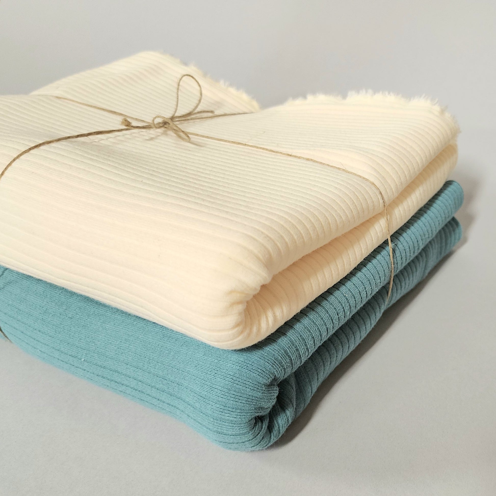Bundle includes 1 yard of Teal Dusk 4x2 rib and 1 yard of Buttercream 4x2 rib. Total is 2 yards.