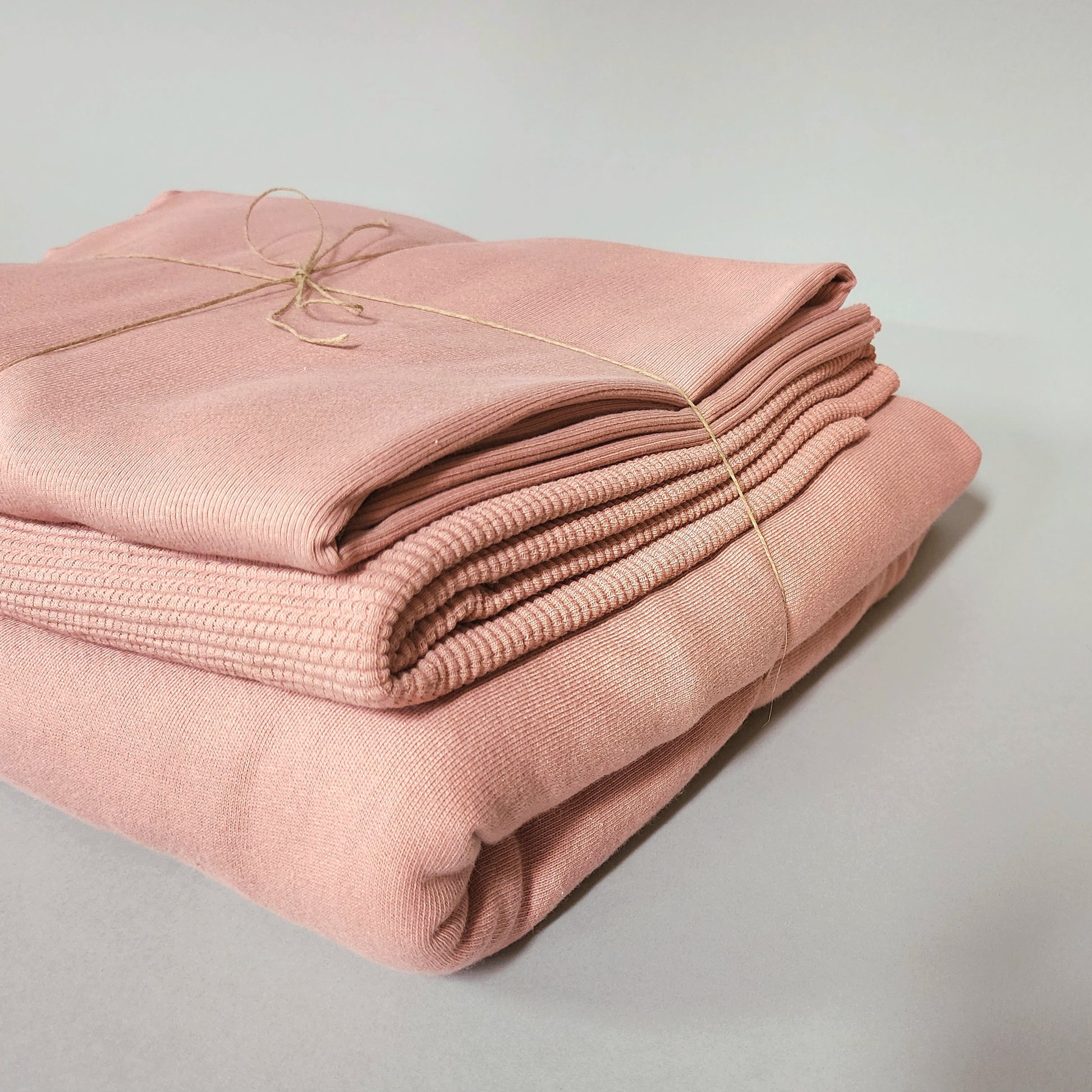 Bundle includes 2 yards of Sunset Rose highloop French terry, 1 yard of Sunset Rose Waffle and 1 yard of Sunset Rose 2x1 rib. Total is 4 yards.